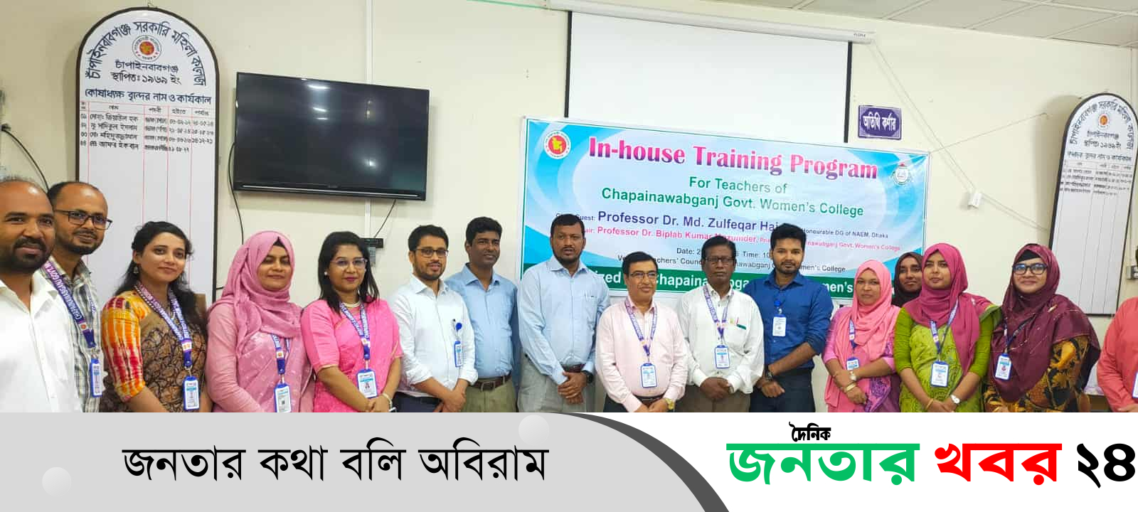 চাঁপাইনবাবগঞ্জ সরকারি মহিলা কলেজে শিক্ষক-কর্মকর্তাদের জন্য ইন-হাউস প্রশিক্ষণ প্রোগ্রাম অনুষ্ঠিত হয়। মঙ্গলবার (২৯ জুলাই) কলেজের শিক্ষক মিলনায়তনে দিনব্যাপী প্রশিক্ষণে প্রধান অতিথি হিসেবে অনলাইনে উদ্বোধনী বক্তব্য রাখেন জাতীয় শিক্ষা ব্যবস্থাপনা একাডেমির (নায়েম) মহাপরিচালক প্রফেসর ড. মোঃ জুলফিকার হায়দার।