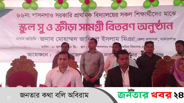 স্টাফ রিপোর্টার লিজা:- নারায়ণগঞ্জ সদর উপজেলার ৬৬ নং শাসনগাও সরকারি প্রাথমিক বিদ্যালয়ের শিক্ষার্থীদের মাঝে স্কুল সু, ক্রীড়া সামগ্রী, চকলেট ও গাছের চারা বিতরণের মাধ্যমে এক উৎসবমুখর অনুষ্ঠানের আয়োজন করা হয়।